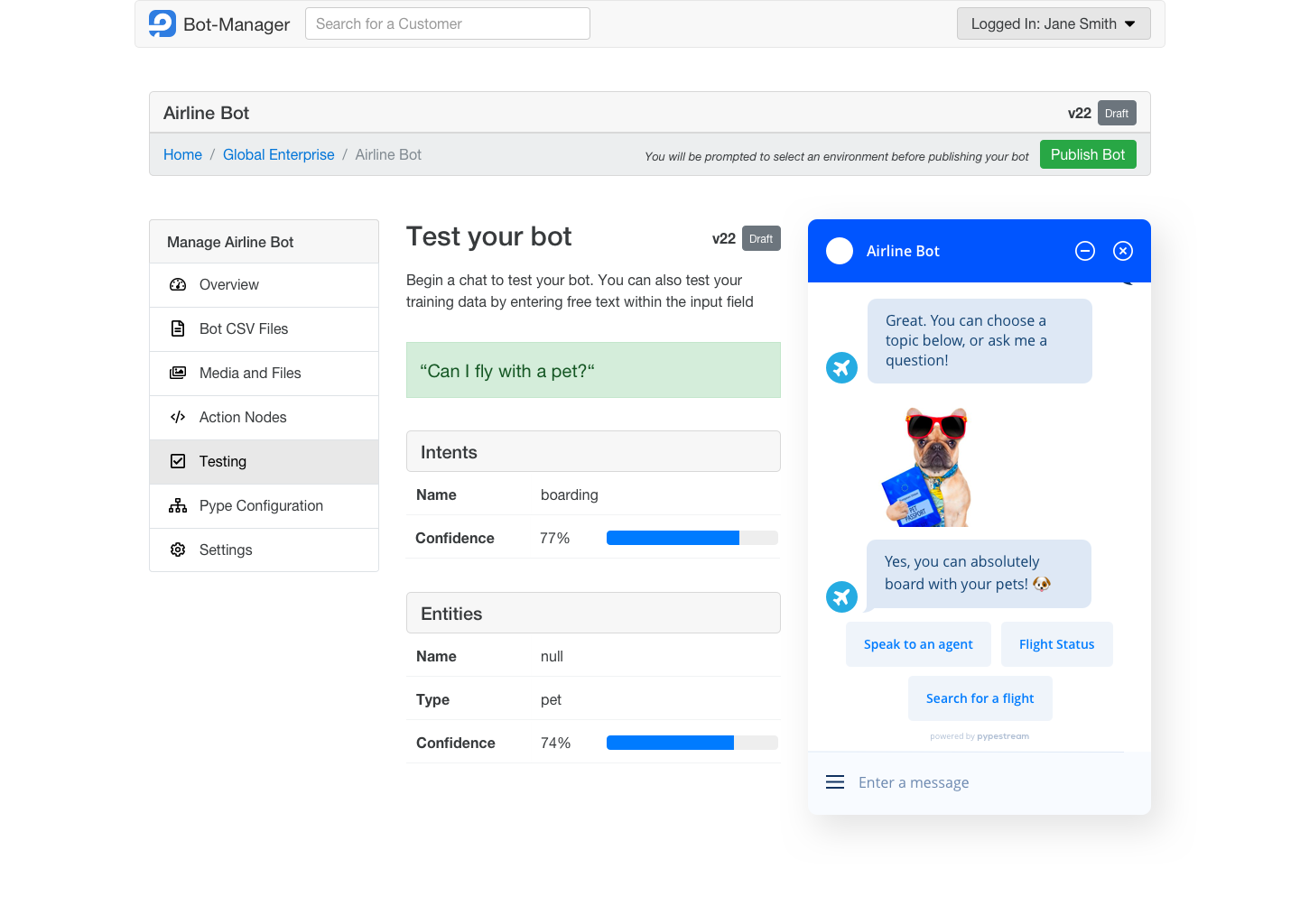 We discovered that high versioning volume was often due to the inability to test a bot before deployment. In tandem with our new version control, we enabled users to test the bot flow and natural language processing within the same interface, enhancing the overall experience for solution designers.